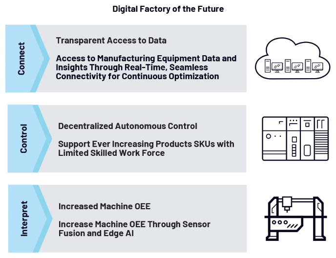 ADI公司對未來數字化工廠的愿景,聚焦于連接、控制和解讀這三大核心支柱。連接戰略旨在通過提升制造業生產效率、可擴展性和靈活性,同時降低碳排放,來達成未來工廠的發展藍圖。確保所有制造資產和機器連接到統一網絡,實現制造數據的透明訪問,并利用這些數據推動整個制造場所的工藝持續改進。制造環境須借助有線和無線混合網絡,實現從邊緣到云端的實時無縫連接。對于有線控制連接,千兆位工業以太網正被部署用于工廠網絡以提供更高的帶寬,同時搭配時間敏感型網絡(TSN)來確保實時流量控制的確定性。對于諸如自主移動機器人(AMR)等移動應用,靈活的專用5G網絡起到補充作用,并且專用5G網絡還可連接難以輕松接入有線工業以太網的遠程傳感器和執行器。